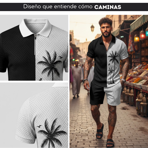 El detalle de las palmeras en el centro fusiona ambas mitades, evocando un espíritu tropical y vacacional.