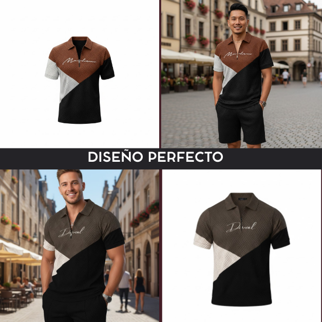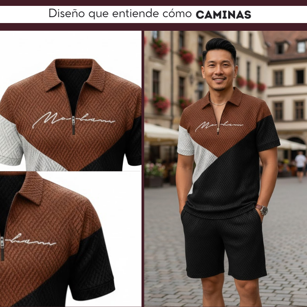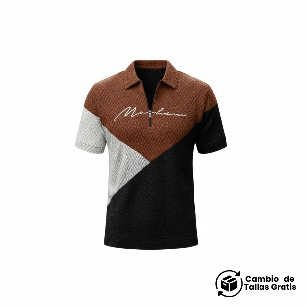 El cuello tipo polo y la cremallera añaden un elemento deportivo y pulcro, mientras que los bloques diagonales inyectan modernidad.