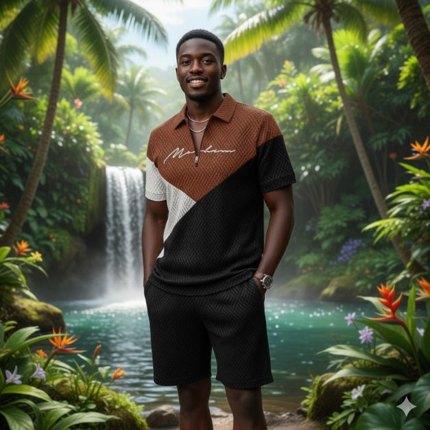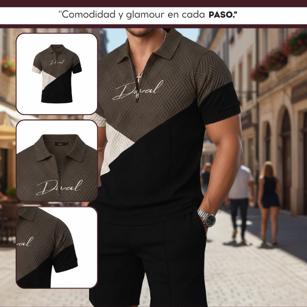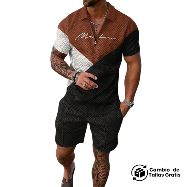 El patrón texturizado, con un relieve de formas geométricas, unifica la camisa y el pantalón corto, confiriéndole una apariencia de alta gama.